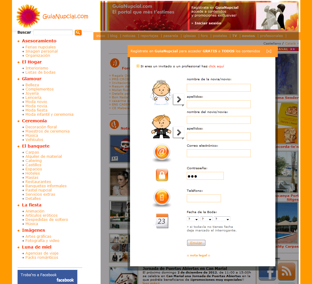 Al fer click a "Regístrate en GuiaNupcial" a la part superior dreta, s'obre una finestra on pots omplir les teves dades i les del teu nuvi, aquestes dades les podràs canviar desprès des del teu perfil, totes les dades excepte el teu correu, que serà el que farem servir com a referència pel teu compte junt amb la contrasenya que triïs.