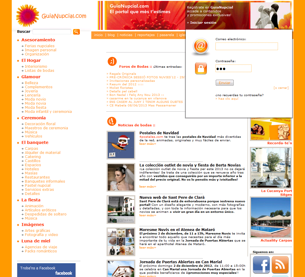 Al fer click a l'enllaç del email sereu redireccionats a la pàgina d'inici de GuiaNupcial, allà heu de fer click a "Iniciar sesión" i posar el vostre email i la contrasenya que vau triar al donar-vos d'alta.